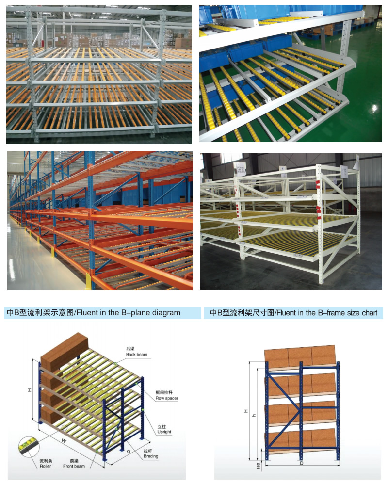Á÷Àûʽ»õ¼Ü¸ù¾Ý×é³É»õ¼ÜµÄ»ù±¾¿ò¼ÜµÄ²ÄÖʿɷÖÎªÖØÐÍÁ÷Àûʽ»õ¼ÜºÍÖÐBÐÍÁ÷Àûʽ»õ¼Ü¡£Á÷Àû»õ¼ÜµÄÁ÷ÀûÌõÖ±½ÓÁ¬½Óµ½Ç°ºóºáÁº¼°ÖмäÖ§³ÅÁºÉÏ£¬ºáÁºÖ±½Ó¹ÒÔÚÖ§ÖùÉÏ£¬Á÷ÀûÌõ°²×°Çãб¶ÈÈ¡ÓÚ»õÏäµÄ³ß´ç¡¢ÖØÁ¿ÒÔ¼°Á÷Àû¼ÜµÄÉî¶È£¬Í¨³£È¡5%¡«9%¡£µ±¹öµÀ½Ï³¤Ê±£¬¿ÉÓ÷ָô°å½«¹öµÀ¸ô¿ª¡£È¡»õ¶ËÐè°²×°ÖÆ¶¯Æ¬Ê¹»õÎï¼õ£¬½µµÍ³å»÷¡£
